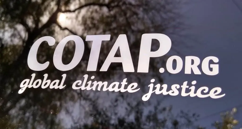As seen on COTAP’s marketing displays, stickers, and postcard flyers, the tagline we’ve chosen is “Global Climate Justice.” Here’s why.